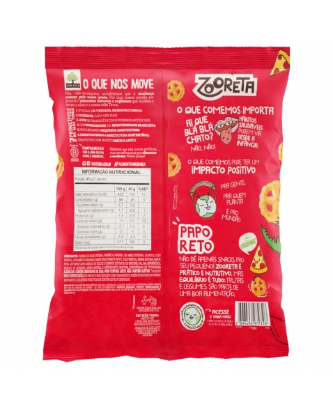 Pense num salgadinho integral, assado, saboroso, livre de pozinhos artificiais e, ainda, orgânico! Difícil de acreditar, né? Mas, existe! O Zooreta Salgadinho sabor pizza é 100% integral e orgânico, tem o sabor de pizza, feito de tomate e apenas temperinhos naturais, sem nada de pozinhos artificiais. Tem 50% menos sódio, é vegano e fonte de Vitamina E. Ele agrada crianças, e é uma opção mais saudável para quando bate aqueeela fominha!
