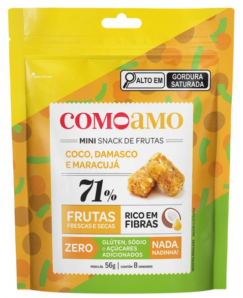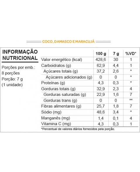 INGREDIENTES: coco in natura, maltitol, damasco seco, polidextrose, maracujá in natura. Conservante: sorbato de potássio. Edulcorante natural: stevia.
