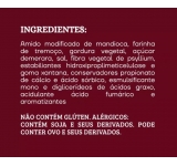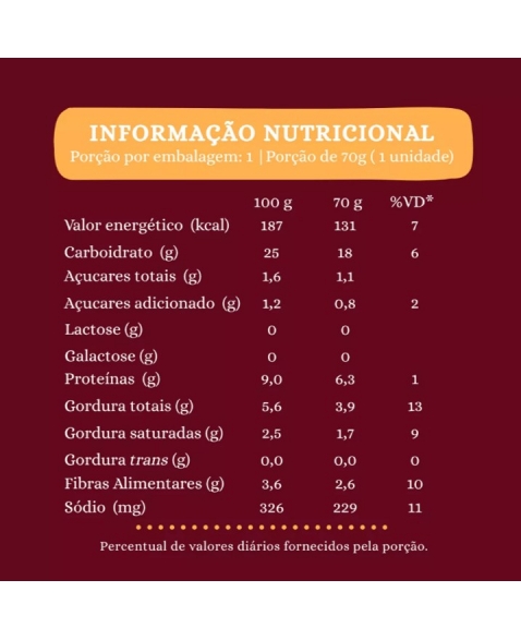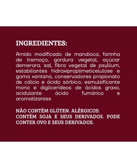 Ingredientes Amido modificado de mandioca, farinha de tremoço, gordura vegetal, açúcar demerara, sal, fibra vegetal de psyllium, estabilizantes hidroxipropilmetilcelulose e goma xantana, conservadores propionato de cálcio e ácido sórbico, emulsificante mono e diglicerídeos de ácidos graxos, acidulante ácido fumárico e aromatizantes.